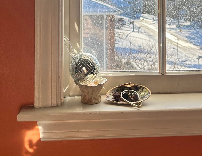 the way the sharp, snow-glaring sunshine cosmically smacks into my little windowsill disco ball ornament (balancing atop some rose quartz, ofc) shooting little spot beams across my childhood (and heck, adulthood) room. ignore the dirty window please it’s just too cold to shove my arm out there and windex the outside