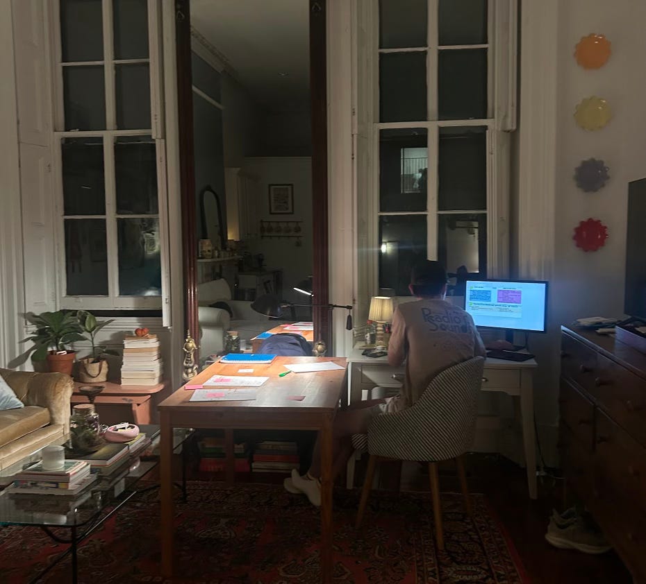 his chaotic late-night study setup that makes me smile (and itch hah)